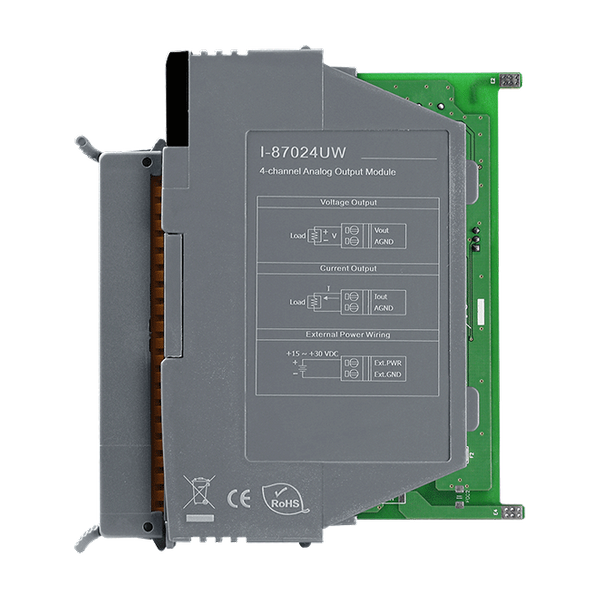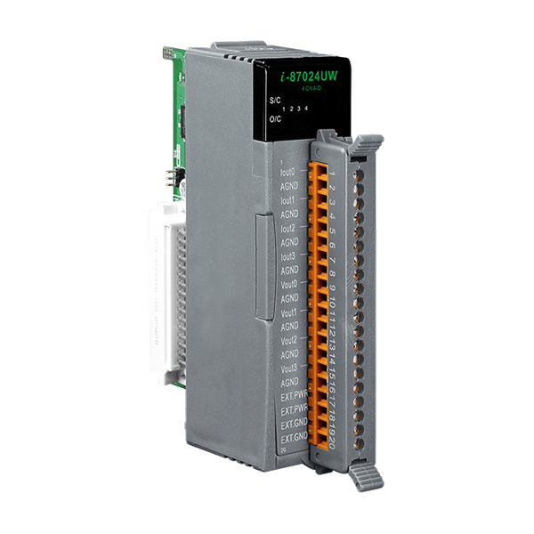 I-87024UW to moduł wyjściowy analogowy typu źródło, który zawiera 4 jednozakończeniowe kanały wyjściowe analogowe i oferuje opcje ustawiania wartości przy włączeniu oraz wartości bezpiecznej. Zapewnia również programowalny zakres wyjść analogowych (0 ~ 5 V, +/-5 V, 0 ~ 10 V, +/-10 V, +4 ~ +20 mA lub 0 ~ +20 mA), a każde wyjście analogowe można skonfigurować dla indywidualnego zakresu. Moduł zapewnia poziom odporności na zakłócenia RF zgodny z normą IEC 61000-4-3. Dodatkowo, moduł posiada funkcję wykrywania otwartego obwodu dla wyjścia +4 ~ +20 mA, ochronę ESD 4 KV oraz izolację międzykanałową 2500 VDC.