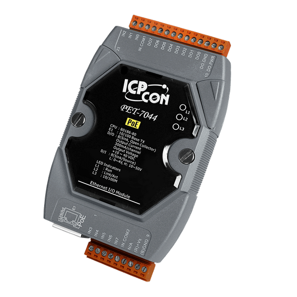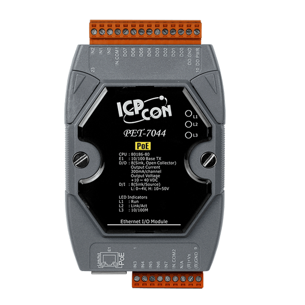 Model PET-7044 oferuje 8 kanałów cyfrowych wejść mokrych oraz 8 kanałów cyfrowych wyjść typu sink. Posiada izolację optyczną 3750 Vrms w celu ochrony przed przetężeniami, ale nie zapewnia izolacji między kanałami. Każdy kanał wejściowy może być używany jako 32-bitowy licznik, natomiast każdy kanał wyjściowy może obsłużyć obciążenie 300 mA. Wartość początkowa oraz bezpieczna wartość wyjścia cyfrowego są programowalne. Może być bezpiecznie stosowany w aplikacjach, w których występują niebezpieczne napięcia.