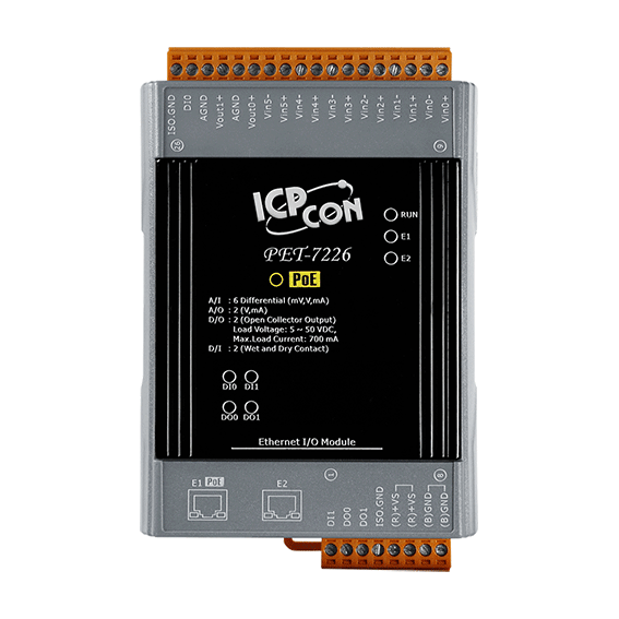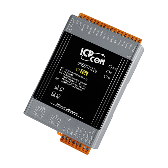 PET-7226 to moduł wielofunkcyjny z 6-kanałowymi wejściami analogowymi, 2-kanałowymi wyjściami analogowymi, 2-kanałowymi wejściami cyfrowymi i 2-kanałowymi wyjściami cyfrowymi. Oferuje różne programowalne wejścia analogowe (+/-500 mV, +/-1 V, +/-5 V, +/-10 V, +/-20 mA, 0 ~ 20 mA oraz 4 ~ 20 mA) i wyjścia analogowe (+/-5 V, +/-10 V, 0 ~ 20 mA i 4 ~ 20 mA). Każde wejście analogowe można skonfigurować na odpowiedni zakres z zabezpieczeniem przed wysokim napięciem do 240 Vrms. Każde wejście/wyjście analogowe można zaprogramować tak, aby przyjmowało prąd lub napięcie w zależności od położenia odpowiedniego zworka.Zastosowania