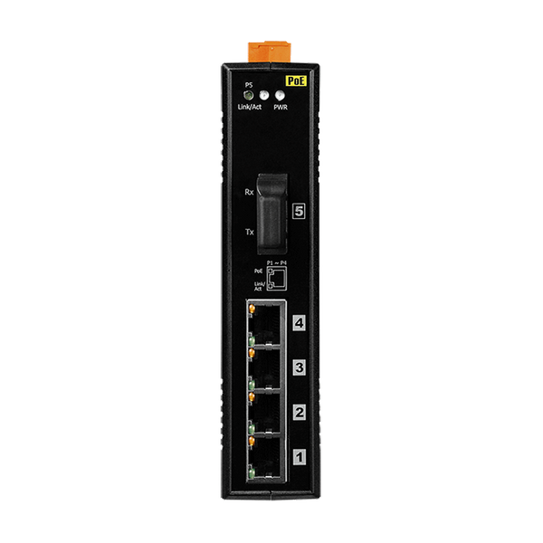 NS-205PFCS-60-24V to 4-portowy niezarządzany przełącznik PoE (PSE) z 1 portem światłowodowym; obsługuje 4 porty PoE, które klasyfikowane są jako urządzenia zasilające (PSE). NS-205PFCS-60-24V umożliwia zrealizowanie scentralizowanego zasilania i dostarcza do 15,4 watów mocy na port PSE. Dzięki wykorzystaniu światłowodów możesz zapobiec zakłóceniom w systemie i obsługiwać szybkie (100 Mbps) oraz dalekosiężne (do 60 km) transmisje. NS-205PFCS-60-24V zaprojektowano z wzmocnieniem zasilania od 24 VDC do 48 VDC dla aplikacji PoE, gdzie zasilanie 48 VDC jest niedostępne.