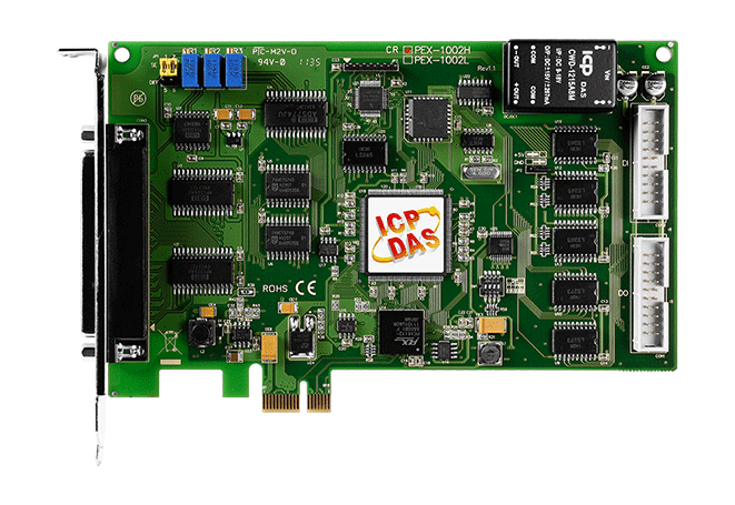 PEX-1002H obsługuje magistralę PCI Express. Karty te to rodzina kart A/D z funkcją niskowzmocnienia 110 kS/s AI. Oferują 12-bitowe 32 jednokońcówkowe lub 16 różnicowych AI, 16 kanałów wejść DI i 16 kanałów wyjść DO.