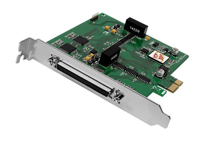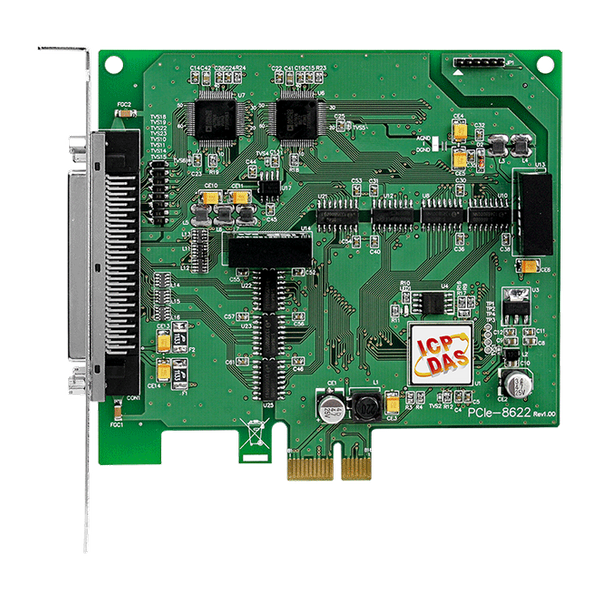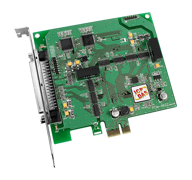 PCIe-8622 obsługuje magistralę PCI Express i zapewnia 12 izolowanych kanałów wejścia cyfrowego, 12 izolowanych kanałów wyjścia cyfrowego oraz 2 kanały wyjścia analogowego o rozdzielczości 16-bit. Karta posiada pojedyncze, wysokiej gęstości złącze, co zmniejsza ilość miejsca wymaganą do instalacji.