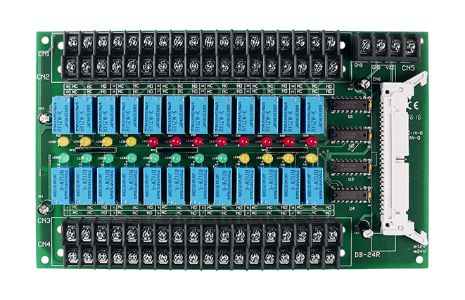 DB-24R składa się z 24 przekaźników elektromechanicznych typu C, umożliwiających efektywne przełączanie obciążenia poprzez zaprogramowaną kontrolę. Kontakty każdego przekaźnika mogą kontrolować obciążenie 0.5 A / 110 V lub 1A / 24V DC. Przekaźnik jest aktywowany poprzez podanie sygnału napięcia 5V na odpowiedni kanał przekaźnika na kompatybilnym z OPTO-22 złączu 50-pinowym lub złączu D-Sub 37. Dwadzieścia cztery diody LED, jedna dla każdego przekaźnika, świecą się, gdy ich przypisane przekaźniki są aktywowane. Aby uniknąć przeciążenia zasilania komputera, ta płyta wymaga zewnętrznego zasilania +12VDC lub +24VDC.Główne cechy
