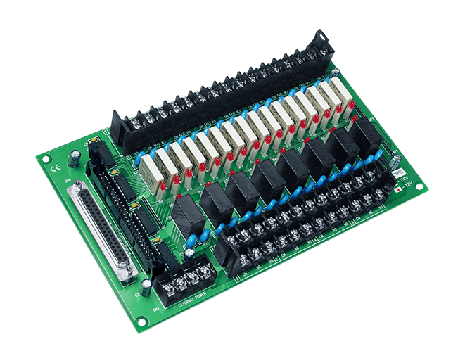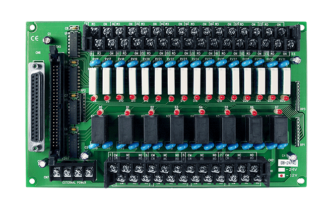 - DB-24PR: Akceptuje 50-pinowe złącze do sterowania 8 przekaźników typu Form C i 16 przekaźników typu Form A lub akceptuje 20-pinowe złącze do sterowania 8 przekaźników typu Form C i 8 przekaźników typu Form A