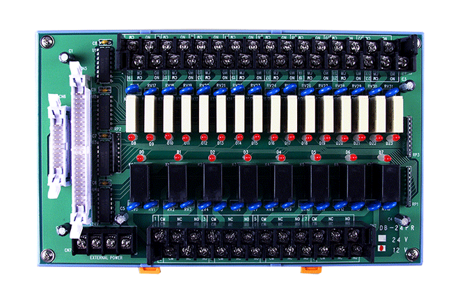- DB-24PR: Akceptuje złącze 50-PIN do sterowania 8 przekaźnikami Form C i 16 przekaźnikami Form A lub akceptuje złącze 20-PIN do sterowania 8 przekaźnikami Form C i 8 przekaźnikami Form A