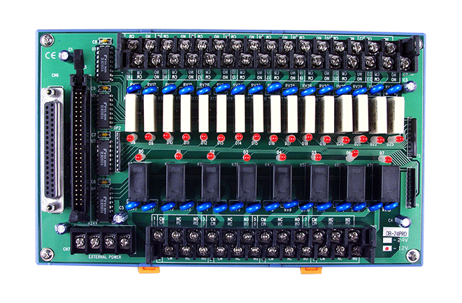 - DB-24PR: Akceptuje 50-pinowe złącze do sterowania 8 przekaźnikami Form C i 16 przekaźnikami Form A lub 20-pinowe złącze do sterowania 8 przekaźnikami Form C i 8 przekaźnikami Form A