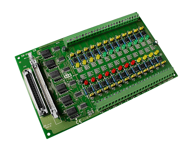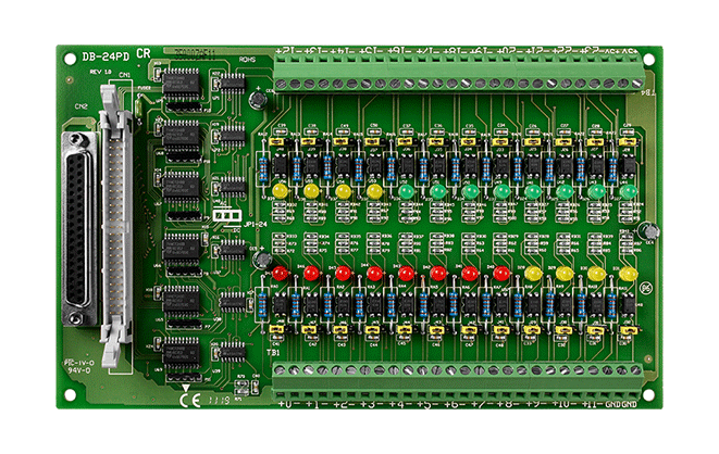 DB-24P to 24-kanałowa izolowana karta wejść cyfrowych dla DIO24, DIO48, DIO144, PIO-D144, kompatybilna z cyfrowymi kartami wejść OPTO-22. Optoizolowane wejścia DB-24P składają się z dwukierunkowego optoizolatora z rezystorem do pomiaru prądu. Można używać DB-24P do wykrywania sygnałów DC od poziomów TTL do 24V. Można także używać DB-24P do wykrywania szerokiego zakresu sygnałów AC. DB-24P rejestruje stały stan logiczny wysoki, jeśli częstotliwość wejściowego sygnału AC wynosi co najmniej 1 kHz, a napięcie sygnału AC jest na poziomie co najmniej 4Vrms. Jeśli używasz sygnału wejściowego AC, musisz zewrzeć zworkę filtra AC. Można używać tej karty do izolacji komputera od dużych napięć wspólnych, pętli masy oraz przepięć, które często występują w środowiskach przemysłowych.