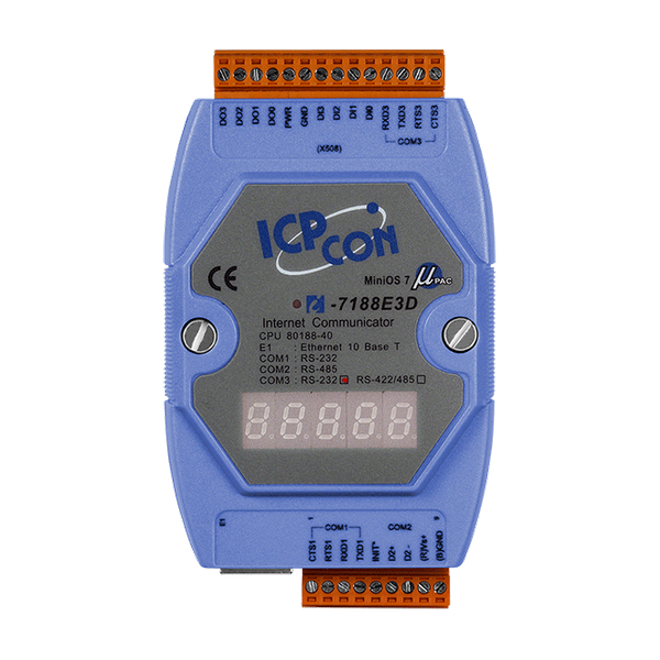 Model I-7188E3(D)-232 jest wyposażony w 2 porty RS-232 i 1 port RS-485. Zdejmowane złącze blokowe terminali na płycie jest zaprojektowane do łatwego i solidnego okablowania w warunkach przemysłowych.