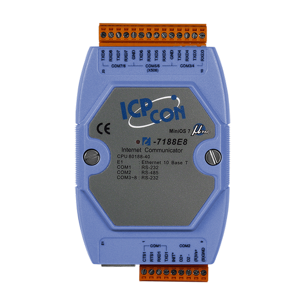 I-7188E8(D) jest wyposażony w 7 portów RS-232 i 1 port RS-485. Odłączany blok złącz terminalowych na pokładzie jest zaprojektowany do łatwego i solidnego okablowania w środowiskach przemysłowych.