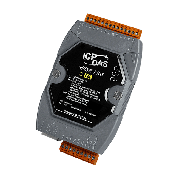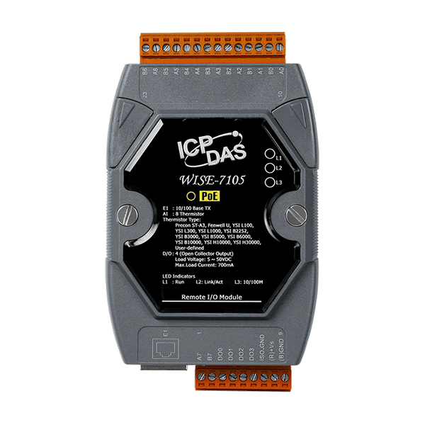 Ten wielofunkcyjny moduł WISE-7105 wspiera protokół Modbus/TCP, umożliwiając płynną integrację z oprogramowaniem SCADA. Posiada 16-bitowe, 8-kanałowe wejścia termistorów oraz 4-kanałowe wyjścia cyfrowe. Każdy kanał analogowy można skonfigurować indywidualnie.