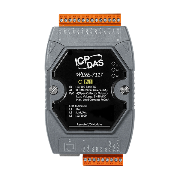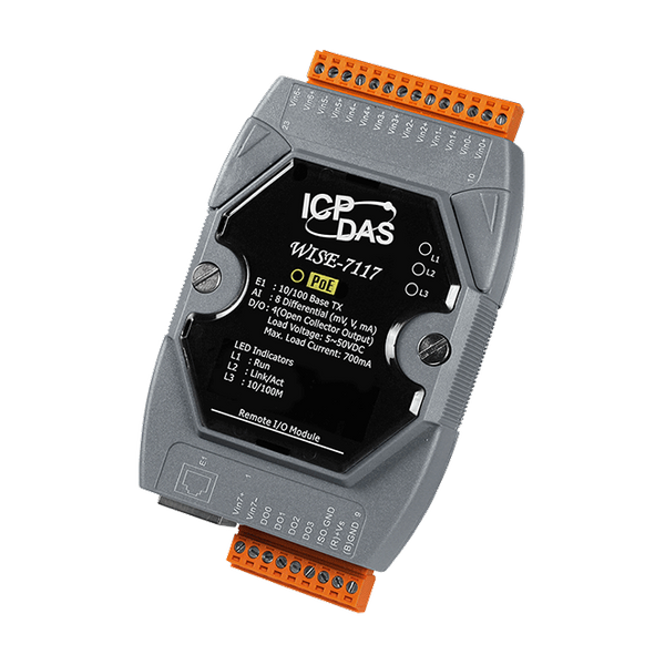 Ten wielofunkcyjny moduł WISE-7117 obsługuje protokół Modbus/TCP, co umożliwia bezproblemową integrację z oprogramowaniem SCADA. Posiada 16-bitowe, 8-kanałowe różnicowe wejścia analogowe oraz 4-kanałowe wyjścia cyfrowe. Każdy kanał analogowy można skonfigurować indywidualnie oraz posiada ochronę przed przepięciem do 240Vrms. Możliwość wyboru zworki dla wejścia napięciowego lub prądowego.