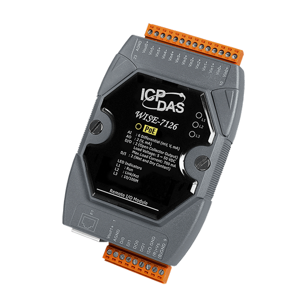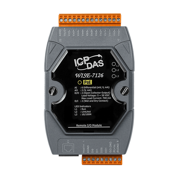 Ten wielofunkcyjny moduł WISE-7126 obsługuje protokół Modbus/TCP, umożliwiając bezproblemową integrację z oprogramowaniem SCADA. Posiada 6-kanałowe wejścia analogowe, 2-kanałowe wyjścia analogowe, 2-kanałowe wejścia cyfrowe i 2-kanałowe wyjścia cyfrowe. Każdy kanał wejścia analogowego oferuje ochronę przed przepięciami do 240 Vrms.