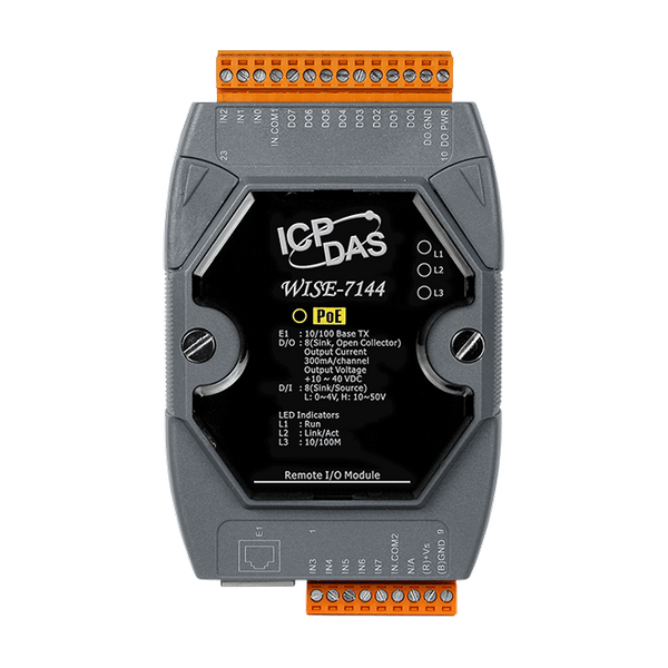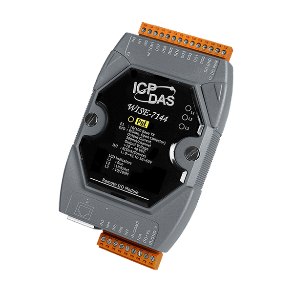 Moduł WISE-7144 obsługuje protokół Modbus/TCP umożliwiający płynną integrację z oprogramowaniem SCADA. Posiada 8-kanałowe izolowane wyjścia otwartego kolektora oraz 8-kanałowe izolowane wejścia cyfrowe typu wet contact. Każdy kanał wyjściowy obsługuje prąd do 300mA przy napięciu +10 ~ 40 VDC, a każdy kanał wejściowy cyfrowy obsługuje funkcję licznika.