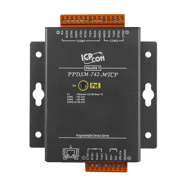 Modele PDS(M)-742(D) i PPDS(M)-742(D)-MTCP są wyposażone w 3 porty RS-232 i 1 port RS-485. Zdejmowana złączka blokowa na płycie umożliwia łatwe i niezawodne okablowanie w przemysłowych warunkach.