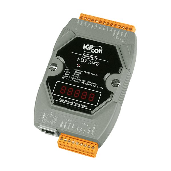 Model PDS(M)-734(D) oraz PPDS(M)-734(D)-MTCP jest wyposażony w 1 port RS-232, 1 port RS-485, 1 port RS-422/485 oraz DI/DO. Wyjmowany blok złącza terminalnego na płycie głównej został zaprojektowany do łatwego i solidnego okablowania w sytuacjach przemysłowych.