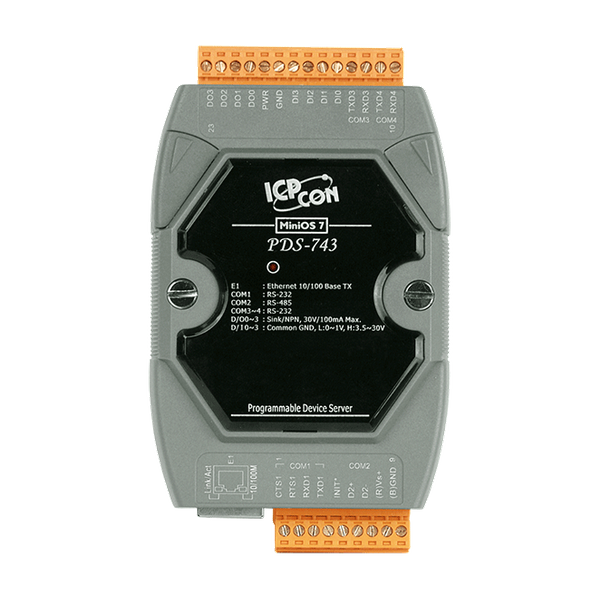 Modele PDS(M)-743(D) i PPDS(M)-743(D)-MTCP są wyposażone w 3 porty RS-232, 1 port RS-485 oraz DI/DO. Zdejmowane złącze bloku zacisków na płycie zapewnia łatwe i solidne okablowanie w warunkach przemysłowych.