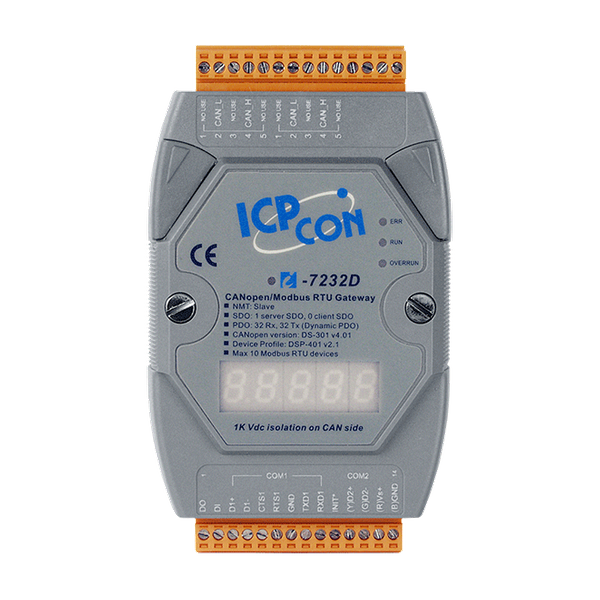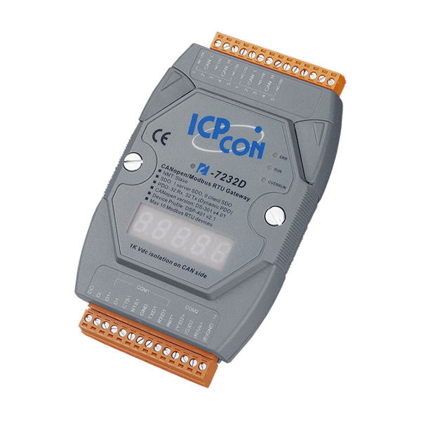 I-7232D to brama CANopen slave do Modbus RTU master, która pozwala masterowi CANopen na dostęp do urządzeń slave Modbus. W sieci CANopen I-7232D jest węzłem NMT slave, serwerem SDO, producentem PDO i konsumentem PDO. Z perspektywy sieci Modbus jest masterem Modbus RTU, który odpytywa wszystkie zdefiniowane dane urządzeń slave Modbus RTU i przekazuje polecenia sterujące CANopen do urządzeń slave Modbus. I-7232D jest zgodny ze specyfikacjami CANopen CiA-301 v4.02 i CiA-401 v2.1, oferując wiele funkcji protokołów CANopen, takich jak dynamiczne PDO, obiekt EMCY, wartość wyjścia błędu, cykliczny i acykliczny SYNC. Podobnie jak w przypadku I-7231D, użytkownicy mogą łatwo zastosować I-7232D w standardowym masterze CANopen przy użyciu pliku EDS dostarczonego przez narzędzie użytkowe.
