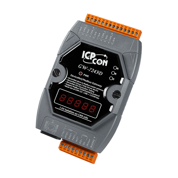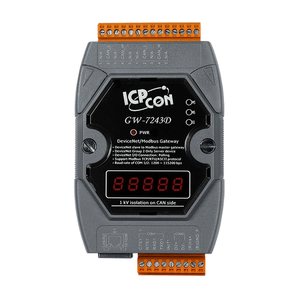 GW-7243D oferuje funkcje DeviceNet slave oraz Modbus master, umożliwiając masterowi DeviceNet dostęp do urządzeń slave Modbus. W sieci DeviceNet moduł działa jako urządzenie Group 2 Only Server i czeka na ustanowienie połączenia z masterem DeviceNet. W sieci Modbus, GW-7243D jest urządzeniem master i cyklicznie wysyła komendy do urządzeń slave Modbus. Moduł GW-7243D może jednocześnie obsługiwać interfejsy klienta Modbus TCP oraz mastera Modbus RTU/ASCII. Ta funkcja pozwala użytkownikom na integrację różnych rodzajów urządzeń slave Modbus w sieci DeviceNet, niezależnie od tego, czy te urządzenia korzystają z komunikacji Ethernet, RS-232, czy RS-485. Aby uprościć korzystanie z GW-7243D, dołączono narzędzie GW-7243D Utility do konfiguracji i produkcji plików EDS. To narzędzie pomaga szybko i łatwo tworzyć aplikacje.