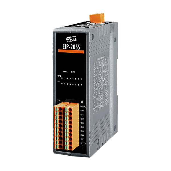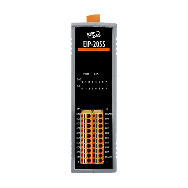 EIP-2000 to seria modułów zdalnych I/O przemysłowych wspierających protokół EtherNet/IP. Użytkownicy mogą bezproblemowo integrować te moduły z siecią Ethernet, od hali przemysłowej po przedsiębiorstwo. EIP-2000 umożliwia połączenie łańcuchowe, co zapewnia elastyczność w umiejscowieniu urządzeń, ułatwia instalację i obniża koszty infrastruktury. Wszystkie moduły mogą być wdrażane w topologiach sieciowych takich jak gwiazda, linia czy pierścień. Projekt izolacji chroni EIP-2000 przed szkodliwymi zakłóceniami. EIP-2055 jest zdalnym modułem cyfrowego wejścia/wyjścia z 8 wejściami i 8 wyjściami. Jest zaprojektowany jako adapter EtherNet/IP. Użytkownicy mogą uzyskać status I/O oraz status połączenia EIP-2055 dzięki diodom LED. Ponadto ICPDAS dostarcza narzędzie programowe do łatwej konfiguracji i testowania modułów EIP-2000 przez Ethernet.