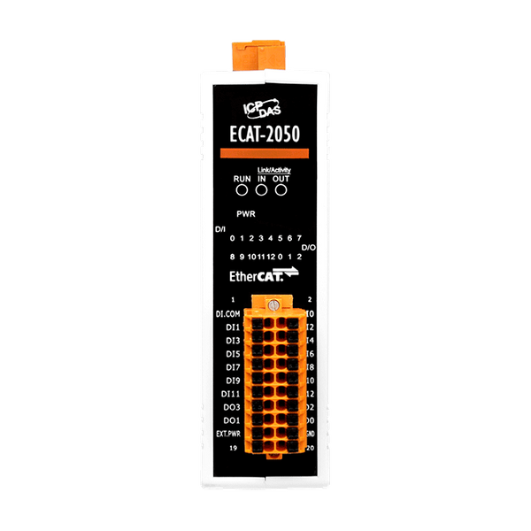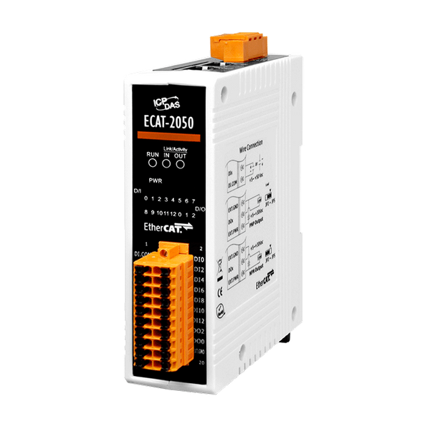 ECAT-2000 jest wyposażony w protokół EtherCAT i może być instalowany w układzie łańcuchowym, co pozwala na dużą elastyczność w instalacji urządzeń i redukcję kosztów infrastruktury i eksploatacji. Wszystkie moduły mogą być konfigurowane jako topologie sieciowe gwiazdy, linii lub pierścienia. Projekt wejść i wyjść izolowanych chroni ECAT-2000 przed szkodliwymi zakłóceniami i środowiskiem. ECAT-2050 posiada wbudowane 4 izolowane wejścia cyfrowe typu źródłowego lub odbiorczego oraz 13 wejść cyfrowych. Użytkownicy mogą monitorować status wejść i wyjść zarówno poprzez dane procesowe, jak i wskaźniki LED. Został przetestowany i zweryfikowany narzędziem testującym zgodność, dlatego każdy zgodny EtherCAT Master lub konfigurator może łatwo z niego korzystać i implementować różne aplikacje.