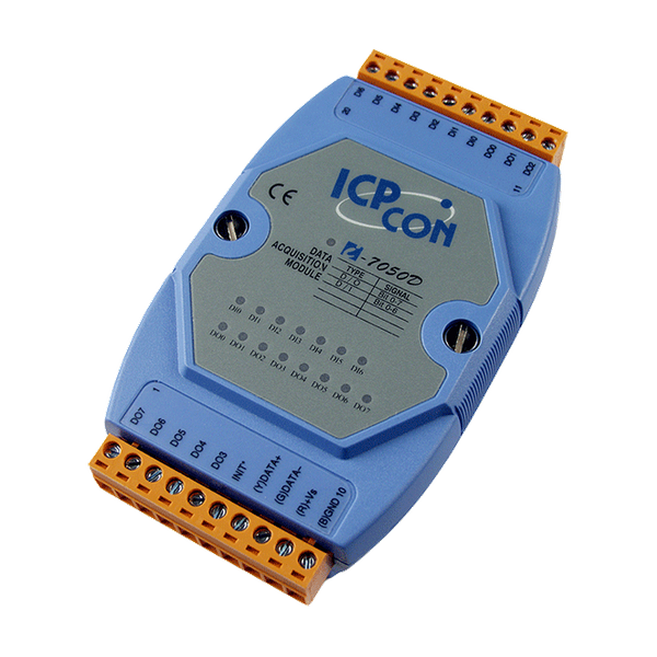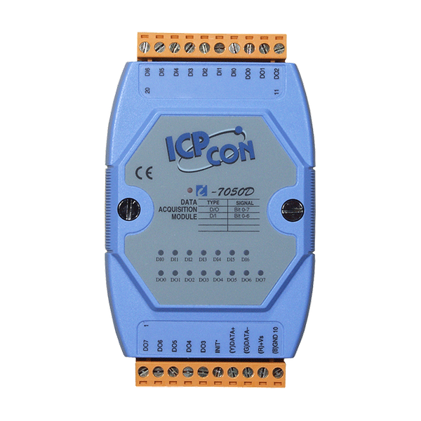 Moduł I-7050/I-7050D oferuje 7 kanałów wejść cyfrowych oraz 8 kanałów wyjść cyfrowych, z których każde jest nieizolowane. I-7050(D) obsługuje wejście typu sink lub source oraz wyjście typu sink z otwartym kolektorem. Wszystkie kanały wejść mogą być używane jako liczniki 16-bitowe. Moduł posiada również opcje konfigurowania zarówno wartości przy włączeniu zasilania (Power-on), jak i wartości bezpiecznych (Safe Value). I-7050D ma 15 wskaźników LED, które mogą być używane do monitorowania statusu kanałów. M-7050 ma te same specyfikacje sprzętowe co I-7050, ale dodatkowo obsługuje protokół Modbus RTU oraz protokół DCON.