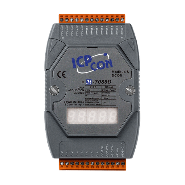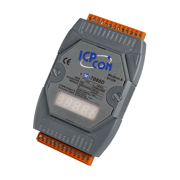 M-7088/M-7088D oferuje 8-kanałowe wyjście PWM (modulacja szerokości impulsu) oraz 8-kanałowe wejście liczników i może być używany do tworzenia efektywnych kosztowo systemów sterowania analogowego. PWM to potężna technika sterowania obwodami analogowymi, która wykorzystuje cyfrowe wyjście do generowania przebiegu o zmiennej szerokości impulsu i częstotliwości, który może być następnie użyty do kontroli obwodów analogowych w takich zastosowaniach, jak sterowanie położeniem lub prędkością silników, jasnością lamp czy prędkością wentylatorów, itp.