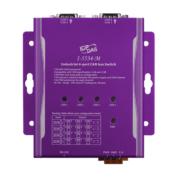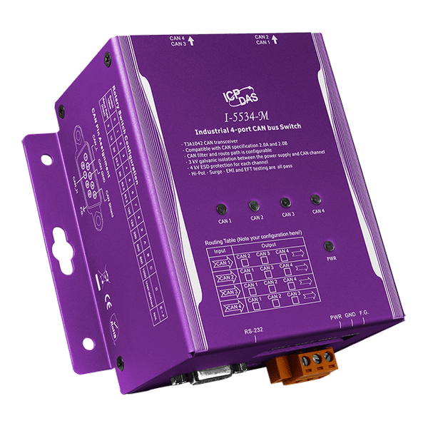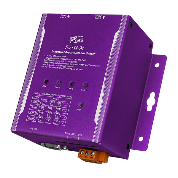 I-5534-M to rodzaj przełącznika magistrali CAN. Posiada cztery niezależne kanały CAN, które oferują elastyczne projektowanie topologii sieci w postaci gwiazdy lub drzewa. Ta nowa topologia może rozwiązać złożone zastosowania magistrali CAN, takie jak maszyny przemysłowe, automatyka budynkowa, automatyka pojazdów itp. Ponadto, I-5534-M integruje i wymienia dane między różnymi sieciami CAN o różnych prędkościach transmisji. Pomaga użytkownikom rozszerzać system sieci CAN. I-5534-M może zwiększyć maksymalną liczbę węzłów CAN w sieci CAN, dzieląc sieć CAN na kilka podsieci. Dodatkowo, obsługiwane są także konfigurowalne prędkości transmisji CAN i konfiguracja filtra CAN.
