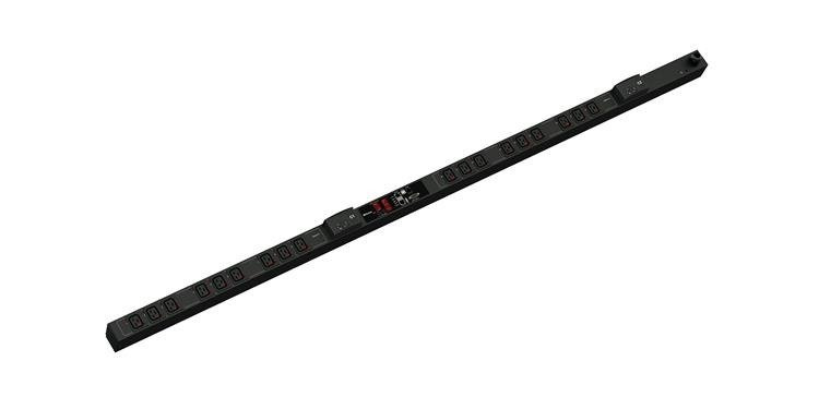 Monitored and switched rack power distribution unit (0U [vertical], 7.4kVA, 18 outlets). INPUT: 230v, 32a - IEC 60309 2P+E 6h 32A plug (2P3W); OUTPUT: 18@ C19 Locking outlets; on 2@ 1-pole, 16a Overcurrent Protectors; FEATURES: Billing-Grade (+/- 1%) Energy Metering [kW, kVA, V, A, Power Factor] - per inlet, per outlet; Remote Outlet Switching (No|rmally-Open Relays); 3-digit LED user-selectable display (voltage, current, or active power : per line, per breaker or per receptacle / outlet). Auto-flip orientation; Remote network monitoring via HTML, JSON-RPC, SSH, Telnet, MODBUS/TCP, and SNMPv3. Onboard embedded processor with minimum 400MHz clock speed, 16MB Flash, and 64MB RAM. Environmental monitoring [temp/humidity] capable