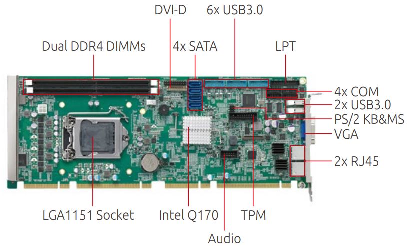 Ta karta procesorowa łączy szybkość szyny PCIe x16 Gen3 (może być skonfigurowana do pracy w trybie 2x PCIe x8 lub 1x PCIe x8 + 2x PCIe x4), PCIe x4 oraz standardową szynę PCI. Dzięki temu może pracować z najnowszymi i wymagającymi kartami PCIe oraz jest wstecznie kompatybilna z sytemami pracującymi na starszej szynie PCI. Jest idealnym rozwiązaniem do systemów automatyki, pomiarów i wymagających aplikacji machine vision.