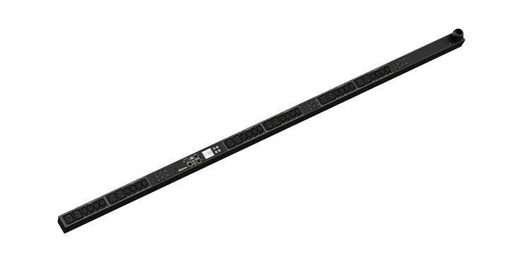 Monitored rack power distribution unit (0U [vertical], 22.2kVA, 36 outlets). INPUT: 400v (3-phase WYE), 32a - IEC 60309 3P+N+E 6h 32A plug (4P5W); OUTPUT: 24@ C13, 12@ C19 outlets; on 6@ 1-pole, 16a Overcurrent Protectors; FEATURES: Billing-Grade (+/- 1%) Energy Metering [kW, kVA, V, A, Power Factor] - per inlet; Color, matrix LCD display : Voltage, current, or active power (per line or per breaker); Alarms; Configuration information (name, ratings, IP / Networking information). Auto-flip orientation; Remote network monitoring via HTML, JSON-RPC, SSH, Telnet, MODBUS/TCP, and SNMPv3. Onboard embedded processor with minimum 400MHz clock speed, 16MB Flash, and 64MB RAM. Environmental monitoring [temp/humidity] capable