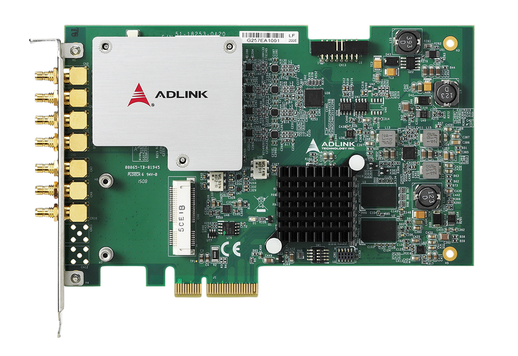 ADLINK's new PCIe-9834 high-speed PCI Express digitizer, featuring four simultaneously sampled 80 MS/s input channels with 16-bit resolution, 40 MHz bandwidth, and up to 1 GB DDR3 onboard memory. Each of the four input channels supports up to 80MS/s sampling, with 16-bit resolution A/D converter. This allows simultaneous recording of signals on all channels with no interchannel phase delay. The extremely large onboard memory enables long recording times even at the highest sampling rates. Each connection pair (lane) can achieve burst connection speeds of 250MB/s. The PCIe-9834, based on x4 lane slot PCI Express technology, provides a clear advantage in that direct connection of each slot allows full transfer bandwidth for each individual card.