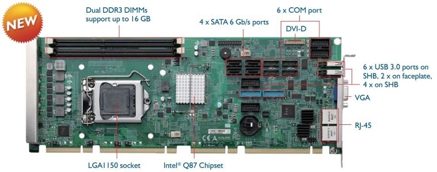 ADLINK NuPRO-E42 to pełnowymiarowa karta procesorowa wykonana w standardzie PICMG® 1.3 (SHB) obsługująca procesory Intel® Core™ i7/i5/i3/Pentium® czwartej generacji, posiadająca chipset Intel® Q87 Express oraz dwa sloty na pamięć DDR3 DIMM z możliwością pracy w trybie Dual-Channel (maks. 16GB).