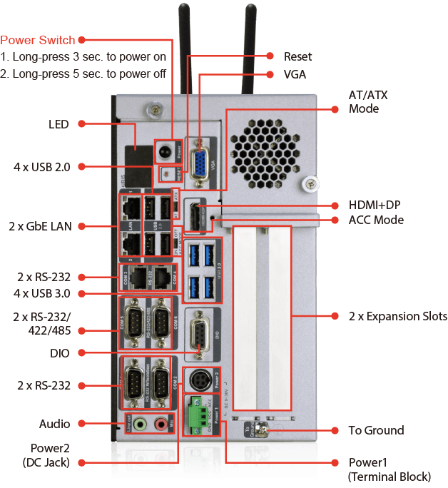 Komputer posiada dwa szerokozakresowe złącza zasilania 9V - 36V DC (DC jack i terminal block) oraz może pracować w zakresie temperatur: -20°C ~ 35°C.