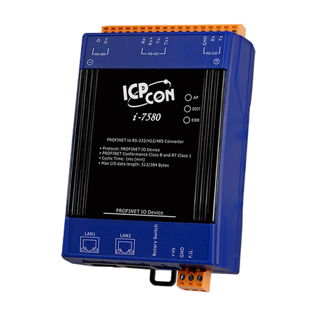 I-7580 jest urządzeniem PROFINET IO z funkcjonalnością RT, które obsługuje interfejsy szeregowe RS-232, RS-422 i RS-485. Użytkownicy mogą wybrać jeden z tych interfejsów komunikacji szeregowej do zastosowania. Umożliwia to łatwe podłączenie niemal każdego urządzenia szeregowego do sieci PROFINET, w tym zdalne urządzenia I/O, czujniki, siłowniki, HMI, czytniki kodów kreskowych i RFID itp.