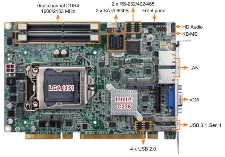 Karta posiada między innymi dwa niezależne wyjścia wideo: VGA i iDP, dwa porty GbE LAN w tym jedno z obsługą Intel® Active Management 11.0 (iAMT), dwa złącza SATA III z obsługą RAID 0/1, slot PCIe Mini (sygnały mSATA i USB) oraz złącza USB (3.1 i 2.0) i COM RS-232/422/485.
