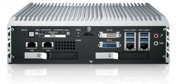 Bogaty interfejs ECS-9055R wyposażono w złącza: 2x 10 GbE LAN (kontroler Intel® X550-AT2 10GigE LAN), 6x GbE LAN w tym 4x PoE+, 4x COM RS-232/422/485 (izolacja ESD 8KV), 6x USB 3.0, 16x DIO (8 DI, 8 DO z izolacją), 3 sloty na karty SIM, 1x Display Port, 1x DVI-I, 1x DVI-D oraz 1 Mic-in, 1 Line-out.