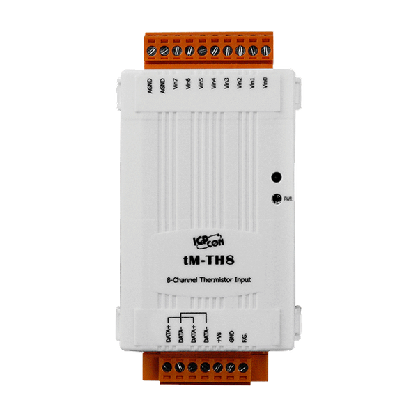 Moduł tM-TH8 to 8-kanałowy izolowany moduł wejściowy termistora, który może być używany do pomiaru temperatury za pomocą termistora. Wspiera wiele typów termistorów, a użytkownik może dodać własne typy poprzez określenie współczynników Steinharta, jeśli to konieczne. Dodana izolacja wewnątrzmodułowa 2500 VDC i ochrona przed przepięciami 120 VDC dla termistora w tM-TH8 zapewniają, że moduł będzie działał z większą niezawodnością.