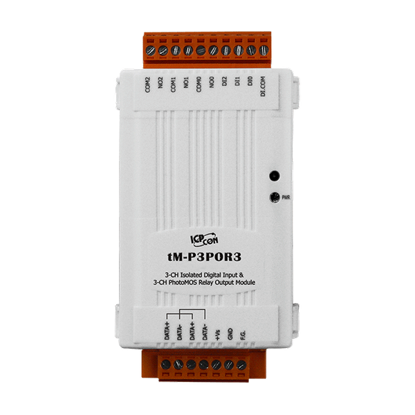 tM-P3POR3 zapewnia 3 cyfrowe kanały wejściowe i 3 kanały wyjściowe przekaźnika PhotoMOS, z których każdy charakteryzuje się izolacją optokoplerową. Wszystkie kanały wyjściowe to przekaźniki PhotoMOS, podczas gdy wejścia są oparte na połączeniu drutowym typu sink lub source. Wszystkie kanały wejściowe mogą być używane jako liczniki 16-bitowe. Istnieją opcje konfigurowania wartości uruchomienia i bezpiecznych wartości wyjść cyfrowych. Przekaźniki PhotoMOS zapewniają szybszy czas reakcji, większą wytrzymałość elektryczną i brak szpilek. Oferują również ochronę przed ESD do 4 kV oraz izolację między modułami o napięciu 3750 VDC.
