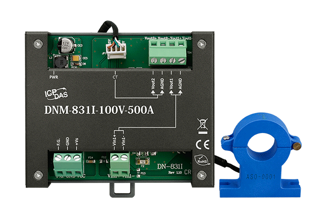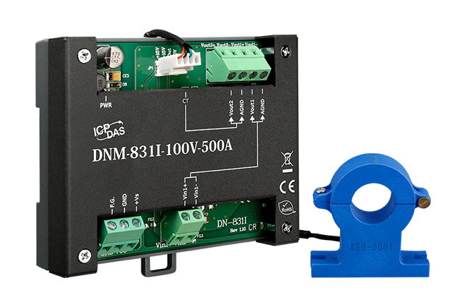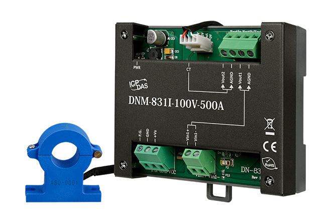 DN-831I-100V-500A to jednokanałowy tłumik napięcia i jednokanałowy transformator prądu. Maksymalny zakres napięcia wejściowego wynosi ±100 V, który można zredukować do ±10 V, a maksymalny zakres prądu wejściowego wynosi ±500 A, który można zredukować do ±10 V. Urządzenie zapewnia izolację między modułami na poziomie 3000 VDC oraz izolację pomiędzy kanałami na poziomie 3000 VDC, co pozwala uniknąć zakłóceń szumowych z wejść na wyjścia lub pomiędzy kanałami. Może być używane z modułami wejść analogowych takimi jak I-7017, I-87017, M-7017RMS i I-87017W-RMS itp., aby mierzyć wysokie natężenia prądu.