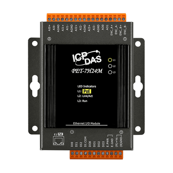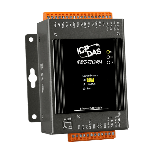 Moduł oferuje programowalny zakres wejściowy we wszystkich kanałach analogowych, a Wyjście Cyfrowe można ustawić na wyjście z ochroną przed zwarciem i przeciążeniem. 1 kanał Wejścia Enkodera może być skonfigurowany jako wejście kwadrantowe, impulsowe/kierunkowe lub CW/CCW. PET-7H24M zapewnia również ochronę ESD 4 kV oraz izolację wewnątrzmodułową 2500 VDC. Dodatkowo, 24-bitowy ADC posiada wbudowany filtr Sinc3 dla dostosowania odpowiedniej częstotliwości próbkowania i filtrowania szumów modulatora i sygnału. PET-7H24M jest odpowiedni zarówno do szerokiego zakresu mobilnych/przenośnych aplikacji pomiarowych, jak i precyzyjnych pomiarów sygnałów.
