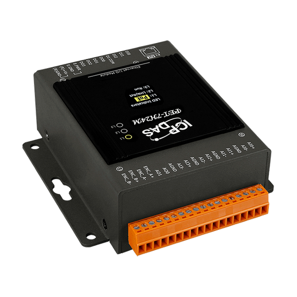 Moduł PET-7H24M to urządzenie do akwizycji danych o wysokiej prędkości, wyposażone w wbudowany port komunikacyjny Ethernet do przesyłu danych w sieci. Zawiera 4 szybkie, 24-bitowe różnicowe kanały wejściowe Analogowe (128 kHz próbkowanie i podtrzymanie dla wszystkich 4 kanałów), 2 kanały Wyjścia Analogowego, 3 kanały Wejścia Cyfrowego, 4 kanały Wyjścia Cyfrowego oraz 1 kanał Wejścia Enkodera.