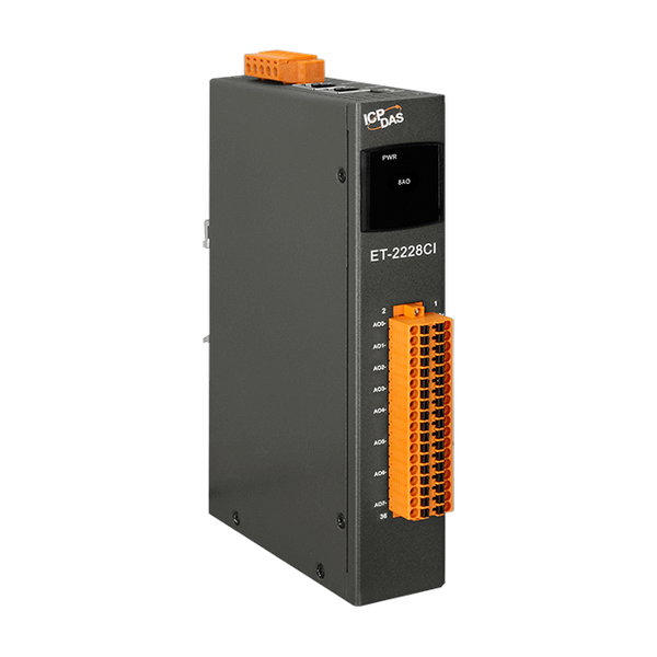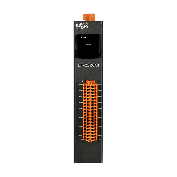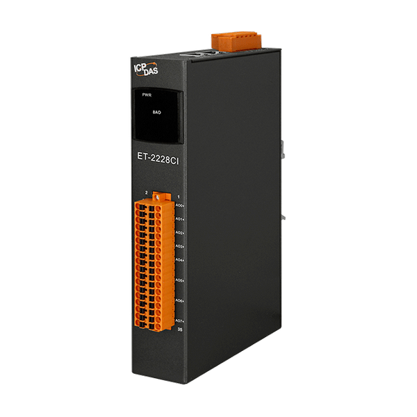 The ET-2228CI is Channel to Channel Isolation analog output module that includes 8 differential analog output channels, and allows a programmable output range on all analog outputs channels (0 ~ 5 V, +/-5 V, 0 ~ 10 V, +/-10 V, +4 ~ +20 mA or 0 ~ +20 mA). Each analog output channel can be configured for an individual range and provides an RF immunity level matching that defined by the IEC 61000-4-3 standard. Voltage and current outputs are programmable selectable, and the module also features per-channel open wire detection for +4 ~ +20 mA outputs, together with 4 kV ESD protection as well as 3750 VDC intra-module isolation. Options for configuring power-on and safe values are also included.