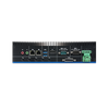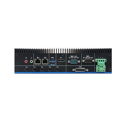 Bogaty interfejs I/O wyposażono w złącza: 4x USB 3.0, 2x RS-232/422/485, 8-bit GPIO, 2 sloty na karty mPCIe (Full-size) z slotami SIM (dostępne z zewnątrz), wyjście zasilające 12V DC (6A), 5 otworów umożliwiających montaż anten, 1x Display Port (4096x2160 @ 60Hz), 1x LVDS (1920x1200 @ 60Hz), 2x GbE LAN RJ-45 oraz 2x Mic-In i 2x Line-Out.