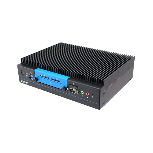 Bogaty interfejs I/O wyposażono w złącza: 4x USB 3.0, 2x RS-232/422/485, 8-bit GPIO, 2 sloty na karty mPCIe (Full-size) z slotami SIM (dostępne z zewnątrz), wyjście zasilające 12V DC (6A), 5 otworów umożliwiających montaż anten, 1x Display Port (4096x2160 @ 60Hz), 1x LVDS (1920x1200 @ 60Hz), 2x GbE LAN RJ-45 oraz 2x Mic-In i 2x Line-Out.