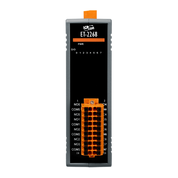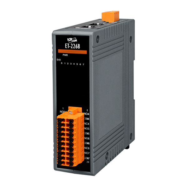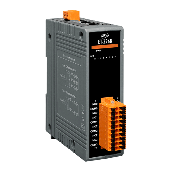 ET-2268 to 8-kanałowy moduł wyjściowy przekaźnika sygnałowego (4 Form A i 4 Form C). Wyposażony jest w 8 diod LED do monitorowania statusu wyjść przekaźników i oferuje konfigurowalne ustawienia wartości uruchamiania i wartości bezpiecznej DO. Moduł zawiera wbudowany 2-portowy przełącznik Ethernet, umożliwiając topologię łańcuchową. Ta funkcja oferuje elastyczność konfiguracji urządzeń, upraszcza instalację oraz redukuje koszty infrastruktury. Ponadto, moduł zapewnia ochronę EMS (EFT/ESD/Surge) i izolację I/O 3000 VDC w celu zwiększenia ochrony przed zakłóceniami w środowiskach przemysłowych. ET-2268 jest odpowiedni do aplikacji przełączania małego sygnału.