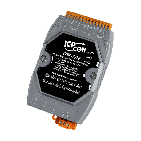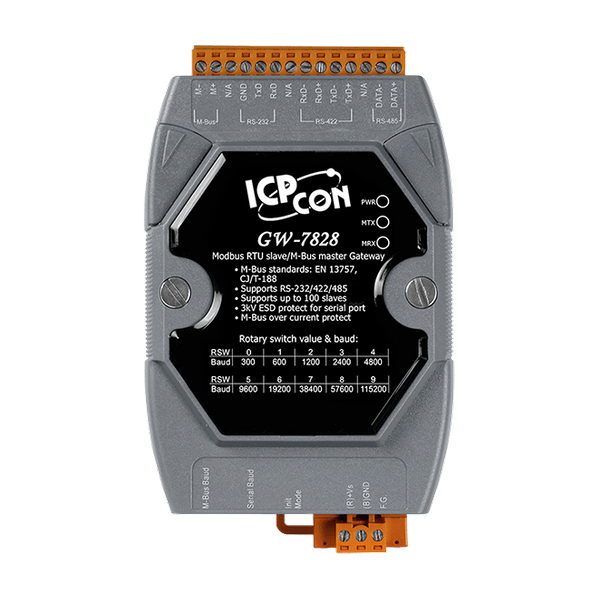 M-Bus ("Meter-Bus") to standard zdalnego odczytu liczników. Jest używany do większości typów liczników zużycia, jak również do różnych czujników i siłowników. GW-7828 jest specjalnie zaprojektowany dla urządzeń podrzędnych M-Bus. Oferuje komunikację Modbus RTU za pośrednictwem trzech rodzajów interfejsów: RS-232, RS-422 i RS-485. Na sprzęcie GW-7828 znajdują się dwa przełączniki obrotowe do ustawiania prędkości transmisji portów szeregowych i portów M-Bus. GW-7828 obsługuje kody funkcji Modbus RTU 0x03 i 0x04 do odczytu danych liczników M-Bus. Dzięki temu projektowi łatwo jest komunikować się z każdym standardowym urządzeniem podrzędnym M-Bus.