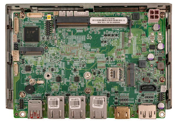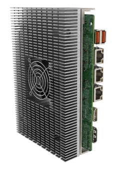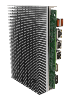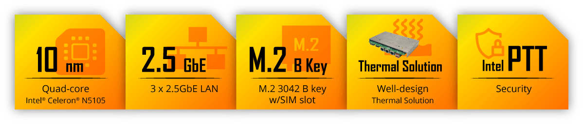 Jest idealny do instalacji w miejscach o ograniczonej przestrzeni, zwłaszcza w pojazdach AGV, AMR (Autonomous Mobile Robot) i małych szafkach w fabrykach. Posiada kompletne interfejsy I/O, takie jak trzy porty LAN 2,5 GbE do sterowania ruchem / kamer IP, złącze M.2 B-key z gniazdem SIM do komunikacji komórkowej LTE oraz porty USB 3.2 Gen 2, DIO oraz porty szeregowe do podłączania czujników i komunikacji z innymi urządzeniami.