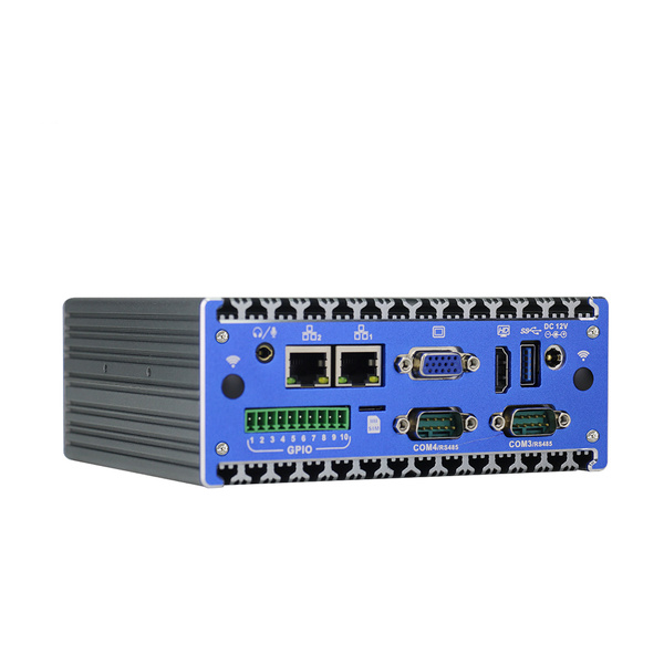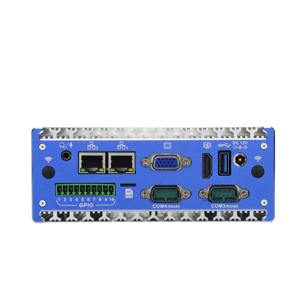 Komputer mimo kompaktowej konstrukcji posiada bogaty interfejs I/O: 1x VGA, 1x HDMI, 1x USB 3.0, 4x USB 2.0, 4x COM, 2x GbE LAN, Audio, GPIO (4 in, 4 out) i slot na kartę SIM.