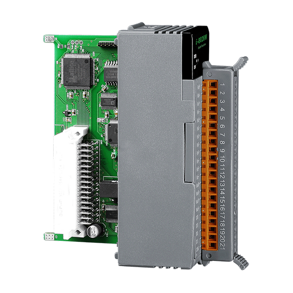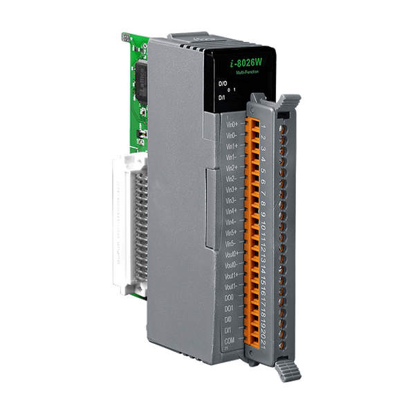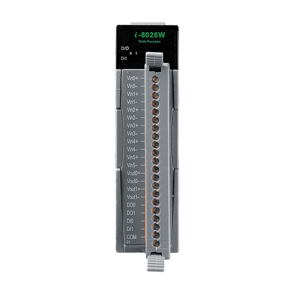 I-8026W to wielofunkcyjny moduł, który zawiera 6 kanałów wejść analogowych, 2 kanały wyjść analogowych, 2 kanały wejść cyfrowych i 2 kanały wyjść cyfrowych. Oferuje programowalny zakres wejścia na wszystkich kanałach analogowych (±10 VDC, ±5 VDC, ±2.5 VDC, ±1.25 VDC, ±20 mA (wybierane przez zworkę)) oraz wyjścia analogowe z rozdzielczością 12-bitową przy ±10 VDC, ±5 VDC, 0 ~ 10 VDC, 0 ~ 5 VDC, 0 ~ 20 mA. Każde wejście analogowe może być skonfigurowane dla indywidualnego zakresu i zapewnia wysoką ochronę przed przepięciem do 240 Vrms. Napięcie i prąd wejść/wyjść są wybierane za pomocą zworki.