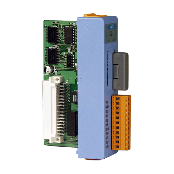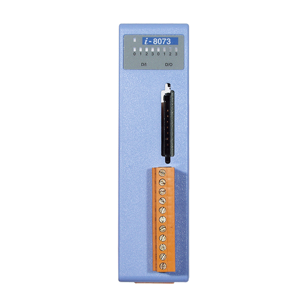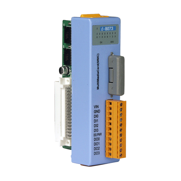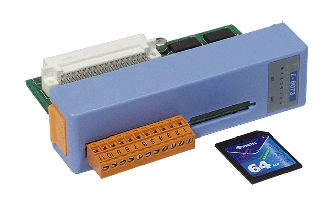I-8073 oferuje urządzenie pamięci masowej MultiMediaCard, 4 kanały wejść cyfrowych, 4 kanały wyjść cyfrowych oraz 1 kanał wejścia analogowego. I-8073 zawiera 8 wskaźników LED do monitorowania statusu wejść i wyjść cyfrowych.